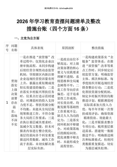 【七哥公文】2026年:2026年学习教育查摆问题清单及整改措施台账(四个方面16条)+更多免费公文+VX:QiGeGongWen2024