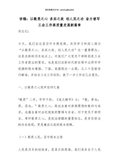 【七哥公文】2026年:讲稿:以敬畏之心 务实之政 创人民之功 奋力谱写工会工作高质量发展新篇章_副本+更多免费公文+VX:QiGeGongWen2024