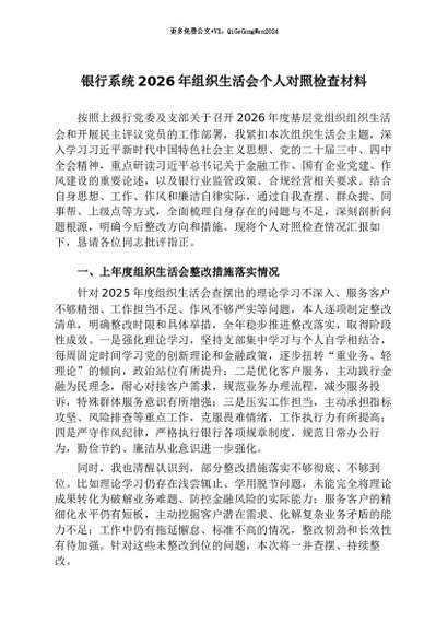/ 【七哥公文】2026年:银行系统2026年组织生活会个人对照检查材料+更多免费公文+VX:QiGeGongWen2024