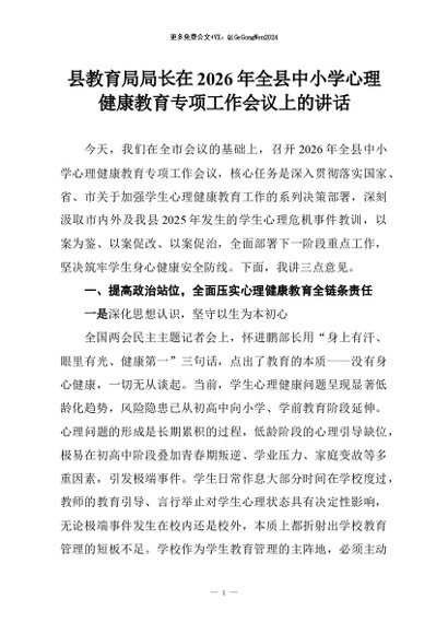 【七哥公文】2026年:县教育局局长在2026年全县中小学心理健康教育专项工作会议上的讲话+更多免费公文+VX:QiGeGongWen2024