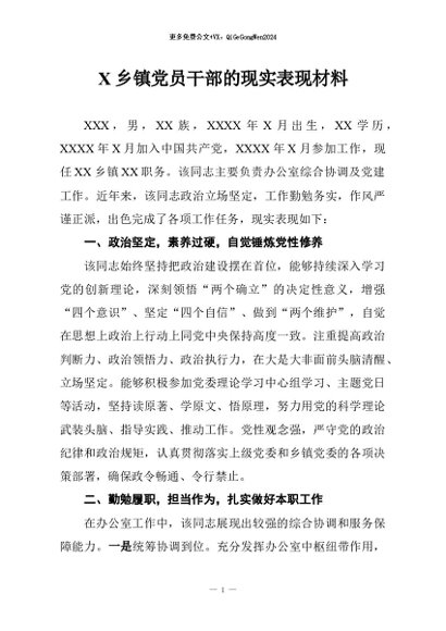 【七哥公文】2026年:X乡镇党员干部的现实表现材料+更多免费公文+VX:QiGeGongWen2024