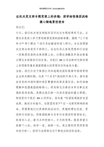 【七哥公文】2026年:在机关党支部专题党课上的讲稿:深学细悟集团战略 凝心铸魂勇担使命_副本+更多免费公文+VX:QiGeGongWen2024