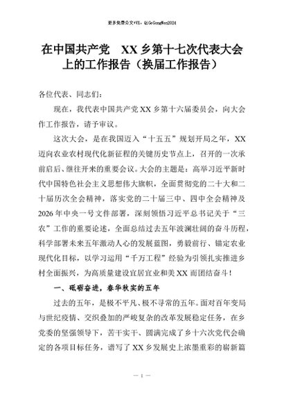 【七哥公文】2026年:在中国共产党 XX乡第十七次代表大会上的工作报告(换届工作报告)+更多免费公文+VX:QiGeGongWen2024