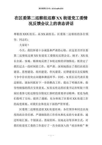 【七哥公文】2026年:在区委第二巡察组巡察XX街道党工委情况反馈会议上的表态讲话+更多免费公文+VX:QiGeGongWen2024