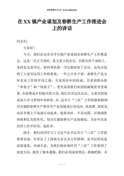 / 【七哥公文】2026年:在XX镇产业谋划及春耕生产工作推进会上的讲话+更多免费公文+VX:QiGeGongWen2024