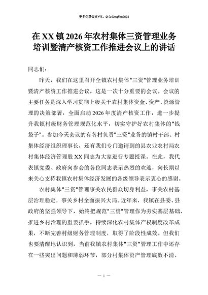 【七哥公文】2026年:在XX镇2026年农村集体三资管理业务培训暨清产核资工作推进会议上的讲话+更多免费公文+VX:QiGeGongWen2024