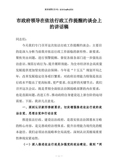 / 【七哥公文】2026年:市政府领导在依法行政工作提醒约谈会上的讲话稿+更多免费公文+VX:QiGeGongWen2024