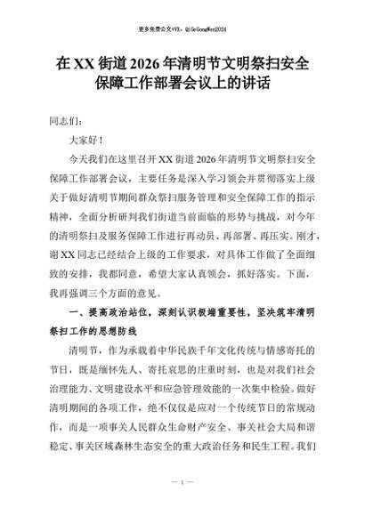 【七哥公文】2026年:在XX街道2026年清明节文明祭扫安全保障工作部署会议上的讲话+更多免费公文+VX:QiGeGongWen2024