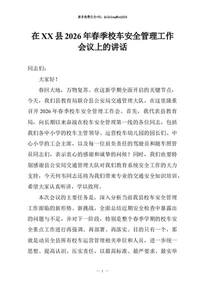【七哥公文】2026年:在XX县2026年春季校车安全管理工作会议上的讲话+更多免费公文+VX:QiGeGongWen2024