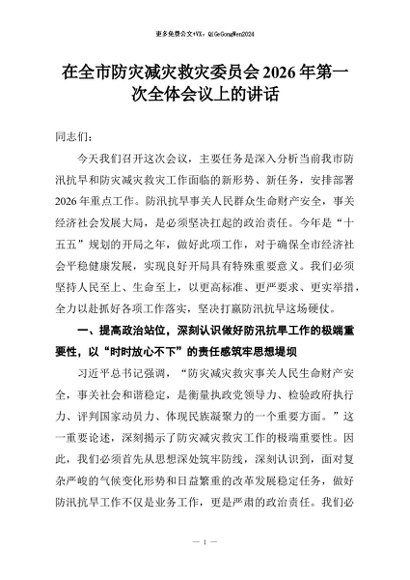 【七哥公文】2026年:在全市防灾减灾救灾委员会2026年第一次全体会议上的讲话+更多免费公文+VX:QiGeGongWen2024