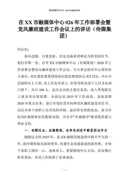 【七哥公文】2026年:在XX市融媒体中心026年工作部署会暨党风廉政建设工作会议上的讲话(传媒集团)+更多免费公文+VX:QiGeGongWen2024