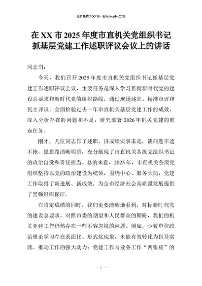 【七哥公文】2026年:在XX市2025年度市直机关党组织书记抓基层党建工作述职评议会议上的讲话+更多免费公文+VX:QiGeGongWen2024