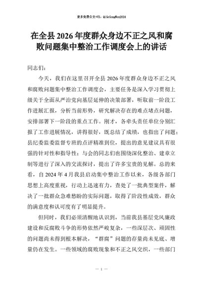 【七哥公文】2026年:在全县2026年度群众身边不正之风和腐败问题集中整治工作调度会上的讲话+更多免费公文+VX:QiGeGongWen2024