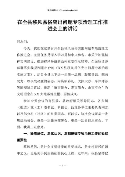 【七哥公文】2026年:在全县移风易俗突出问题专项治理工作推进会上的讲话+更多免费公文+VX:QiGeGongWen2024