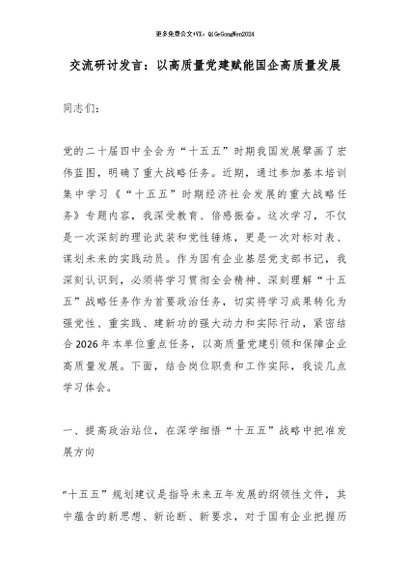 【七哥公文】2026年:交流研讨发言:以高质量党建赋能国企高质量发展_副本+更多免费公文+VX:QiGeGongWen2024