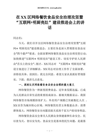 【七哥公文】2026年:在XX区网络餐饮食品安全治理攻坚暨“互联网+明厨亮灶”建设推进会上的讲话+更多免费公文+VX:QiGeGongWen2024