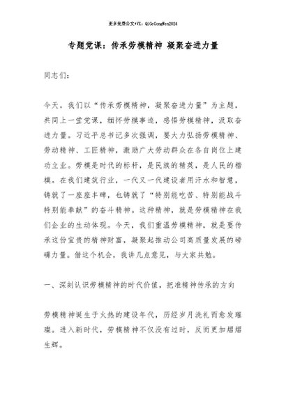 / 【七哥公文】2026年:专题党课:传承劳模精神 凝聚奋进力量_副本+更多免费公文+VX:QiGeGongWen2024