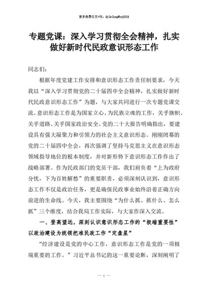 【七哥公文】2026年:专题党课:深入学习贯彻全会精神,扎实做好新时代民政意识形态工作+更多免费公文+VX:QiGeGongWen2024