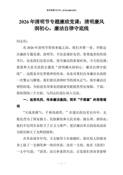 【七哥公文】2026年:2026年清明节专题廉政党课:清明廉风润初心,廉洁自律守底线+更多免费公文+VX:QiGeGongWen2024