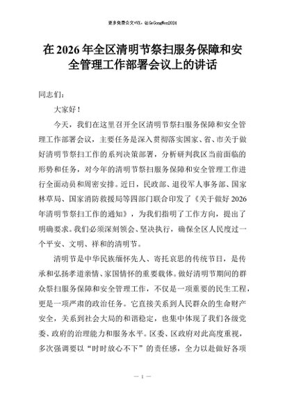 【七哥公文】2026年:在2026年全区清明节祭扫服务保障和安全管理工作部署会议上的讲话+更多免费公文+VX:QiGeGongWen2024