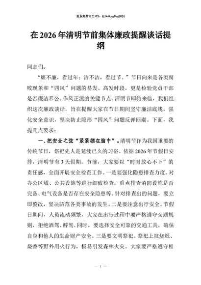 / 【七哥公文】2026年:在2026年清明节前集体廉政提醒谈话提纲+更多免费公文+VX:QiGeGongWen2024