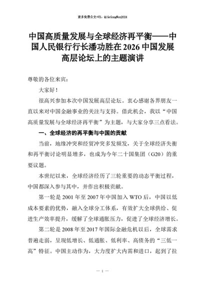 【七哥公文】2026年:中国高质量发展与全球经济再平衡——中国人民银行行长潘功胜在2026中国发展高层论坛上的主题演讲+更多免费公文+VX:QiGeGongWen2024