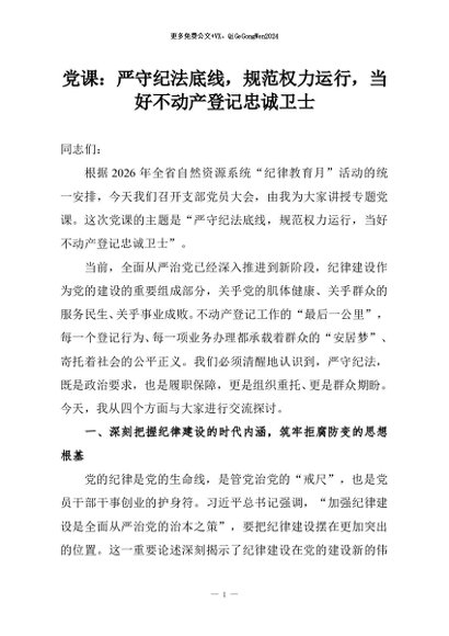 【七哥公文】2026年:党课:严守纪法底线,规范权力运行,当好不动产登记忠诚卫士+更多免费公文+VX:QiGeGongWen2024
