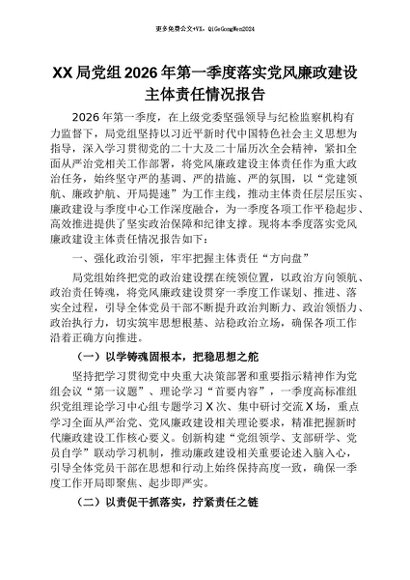 【七哥公文】2026年:XX局党组2026年第一季度落实党风廉政建设主体责任情况报告+更多免费公文+VX:QiGeGongWen2024