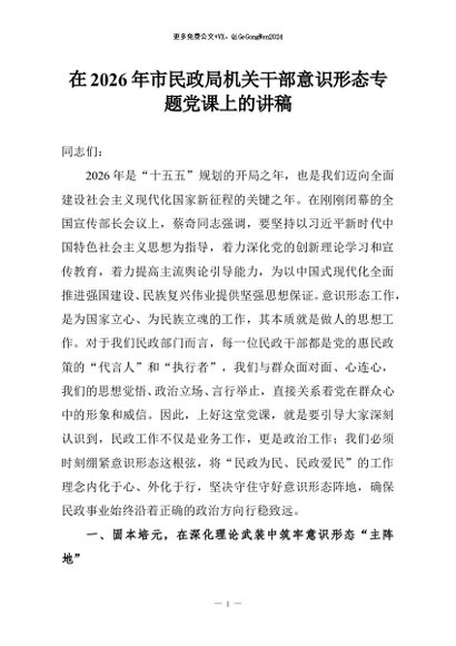 【七哥公文】2026年:在2026年市民政局机关干部意识形态专题党课上的讲稿+更多免费公文+VX:QiGeGongWen2024