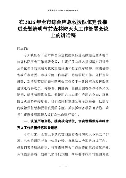 【七哥公文】2026年:在2026年全市综合应急救援队伍建设推进会暨清明节前森林防灭火工作部署会议上的讲话稿+更多免费公文+VX:QiGeGongWen2024