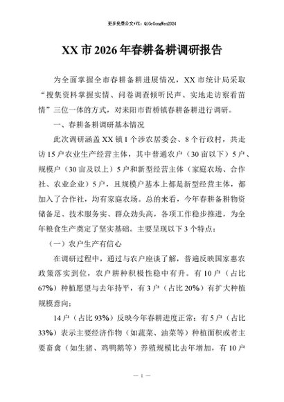 / 【七哥公文】2026年:XX市2026年春耕备耕调研报告+更多免费公文+VX:QiGeGongWen2024