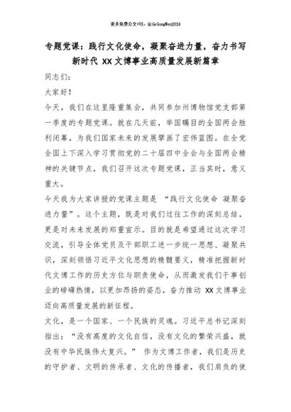 【七哥公文】2026年:专题党课:践行文化使命,凝聚奋进力量,奋力书写新时代 XX 文博事业高质量发展新篇章_副本+更多免费公文+VX:QiGeGongWen2024