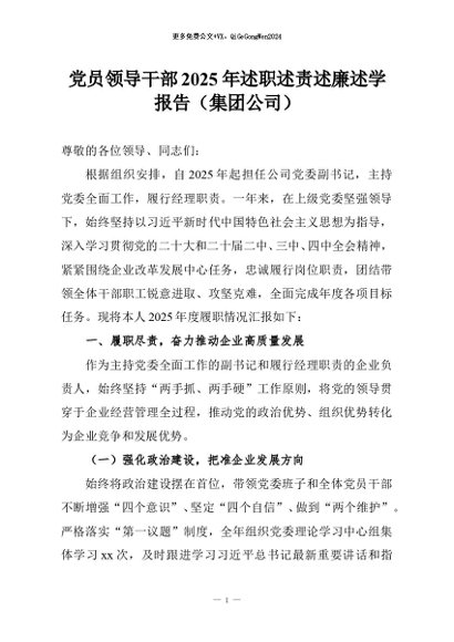 【七哥公文】2026年:党员领导干部2025年述职述责述廉述学报告(集团公司)+更多免费公文+VX:QiGeGongWen2024