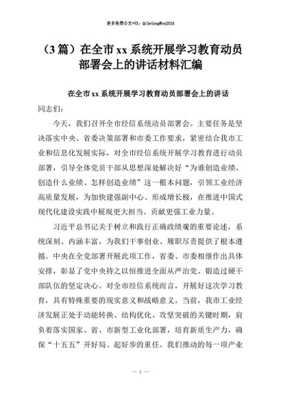 【七哥公文】2026年:(3篇)在全市xx系统开展学习教育动员部署会上的讲话材料汇编+更多免费公文+VX:QiGeGongWen2024