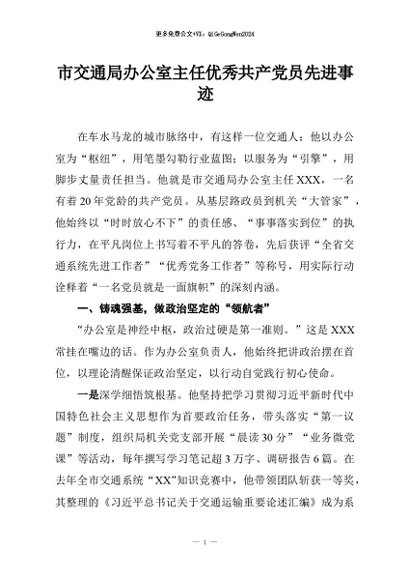 / 【七哥公文】2026年:市交通局办公室主任优秀共产党员先进事迹+更多免费公文+VX:QiGeGongWen2024