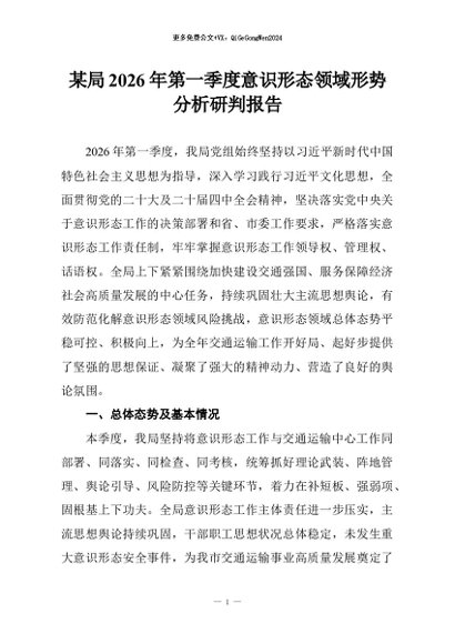 【七哥公文】2026年:某局2026年第一季度意识形态领域形势分析研判报告+更多免费公文+VX:QiGeGongWen2024