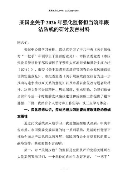 【七哥公文】2026年:某国企关于2026年强化监督担当筑牢廉洁防线的研讨发言材料+更多免费公文+VX:QiGeGongWen2024