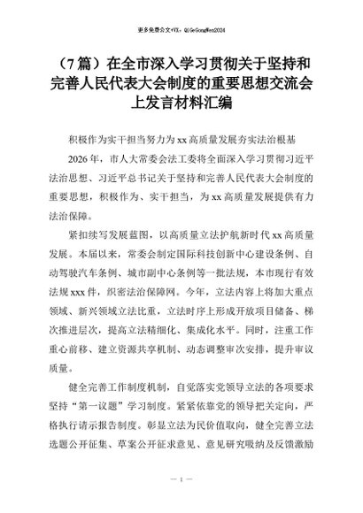 【七哥公文】2026年:(7篇)在全市深入学习贯彻关于坚持和完善人民代表大会制度的重要思想交流会上发言材料汇编+更多免费公文+VX:QiGeGongWen2024