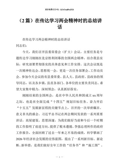 / 【七哥公文】2026年:(2篇)在传达学习两会精神时的总结讲话+更多免费公文+VX:QiGeGongWen2024