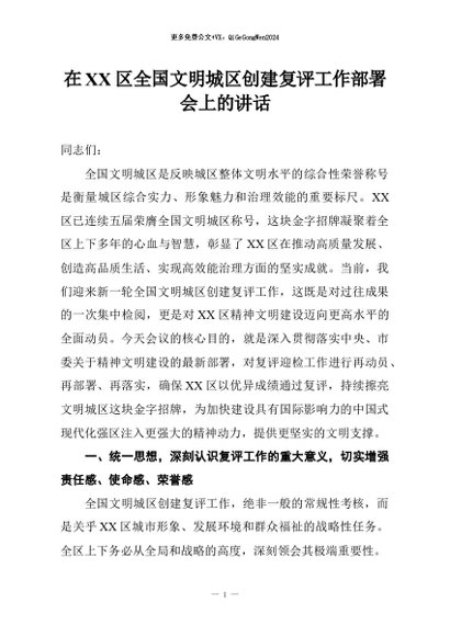 / 【七哥公文】2026年:在XX区全国文明城区创建复评工作部署会上的讲话+更多免费公文+VX:QiGeGongWen2024