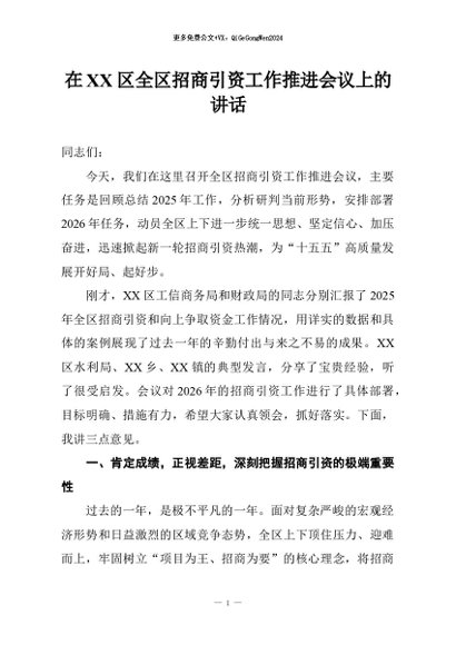 / 【七哥公文】2026年:在XX区全区招商引资工作推进会议上的讲话+更多免费公文+VX:QiGeGongWen2024