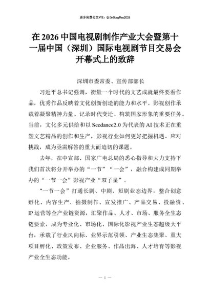 【七哥公文】2026年:在2026中国电视剧制作产业大会暨第十一届中国(深圳)国际电视剧节目交易会开幕式上的致辞+更多免费公文+VX:QiGeGongWen2024