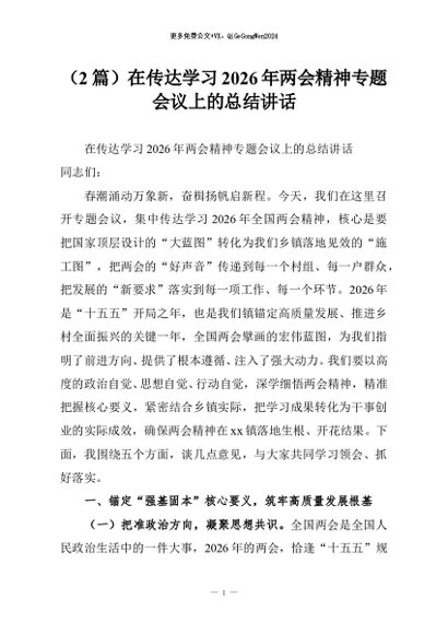 【七哥公文】2026年:(2篇)在传达学习2026年两会精神专题会议上的总结讲话+更多免费公文+VX:QiGeGongWen2024