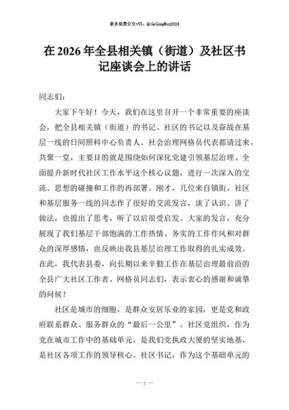 【七哥公文】2026年:在2026年全县相关镇(街道)及社区书记座谈会上的讲话+更多免费公文+VX:QiGeGongWen2024