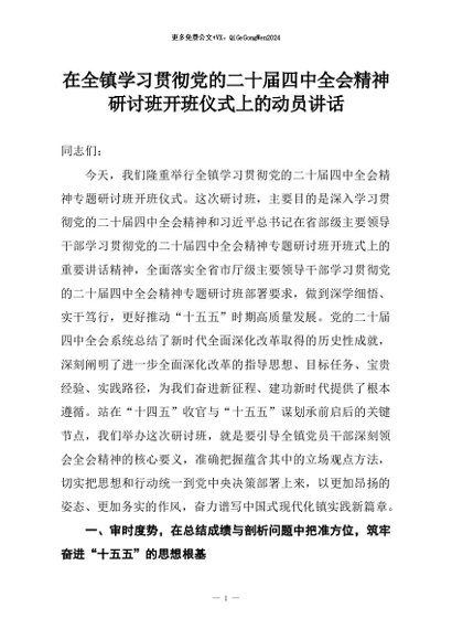 【七哥公文】2026年:在全镇学习贯彻党的二十届四中全会精神研讨班开班仪式上的动员讲话+更多免费公文+VX:QiGeGongWen2024