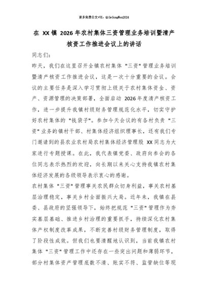 【七哥公文】2026年:在 XX 镇 2026 年农村集体三资管理业务培训暨清产核资工作推进会议上的讲话_副本+更多免费公文+VX:QiGeGongWen2024