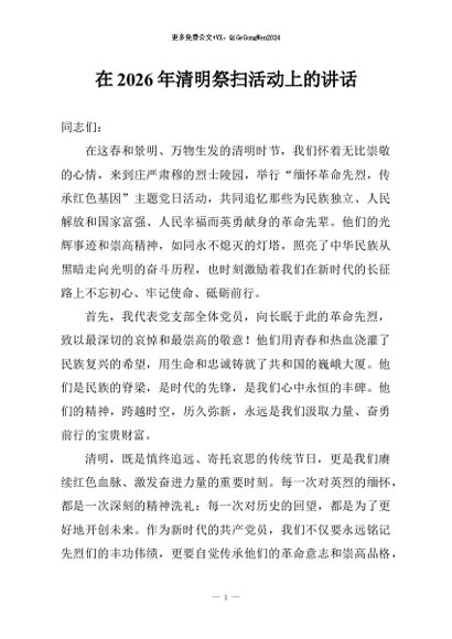 【七哥公文】2026年:在2026年清明祭扫活动上的讲话+更多免费公文+VX:QiGeGongWen2024