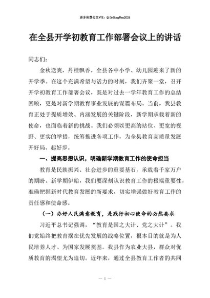 / 【七哥公文】2026年:在全县开学初教育工作部署会议上的讲话+更多免费公文+VX:QiGeGongWen2024