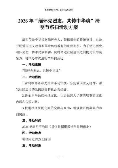 【七哥公文】2026年:2026年“缅怀先烈志,共铸中华魂”清明节祭扫活动方案+更多免费公文+VX:QiGeGongWen2024