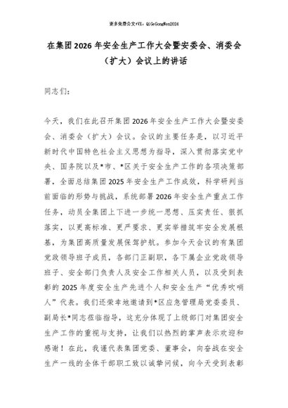 【七哥公文】2026年:在集团2026年安全生产工作大会暨安委会、消委会(扩大)会议上的讲话_副本+更多免费公文+VX:QiGeGongWen2024